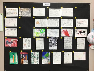 図書委員会が中心となり、読書週間に本に親しんでもらうねらいで、主にカードで本の紹介をしています。本校のPOPは鹿沼市内の図書支援員からも定評があり、鹿沼市の「としょかん」でも展示されたことがあります。各クラスから投票によって選ばれ表彰された作品が展示されています。