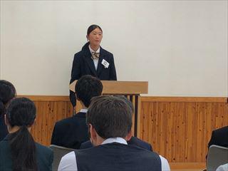 新旧の生徒会役員のあいさつがありました。旧役員からは今まで頑張ってきたことを続けて欲しいというエールが送られました。新役員からはこれからの抱負が語られました。