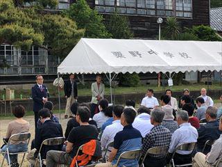 オープンスクールが始まりました。旧粟野中学校会場ではオープンセレモニーが大々的に行われました。多くの地域の方々が訪れ、オープンを祝い、展示物やアトラクションを楽しんでいきました。