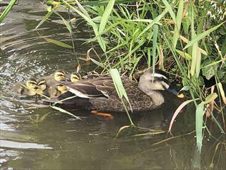 5月中旬より水の広場の草むらでカルガモが卵を温めていました。そして、今日7匹の雛がかえりました。親の後についてかわいく泳ぐ姿が見られました。