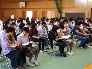 3年生及びその保護者を対象として高校入試説明会を実施しました。約3か月後には私立高校の入試が始まり、その後県立高校の特色選抜、そして県立一般入試と続きます。そこで、私立高校及び県立高校の入試のしくみ等を説明しました。
