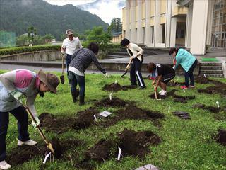 校舎前の芝生花壇が、クローバーで覆われてきていたため、バラを植え、明るい雰囲気にしたいと思いました。これから株が大きくなり、花が咲きほこるのが楽しみになりました。