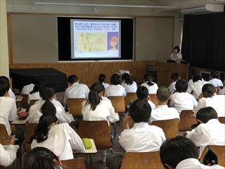 市の保健師さんに来ていただき、3年生対象として生活習慣病教室を実施しました。
