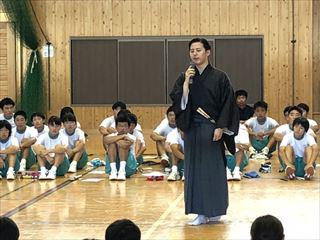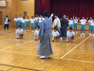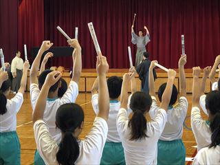文化芸術による子供の育成事業において、「能」の巡回講演が10月に行われます。そこで、公演を鑑賞する前に「能」について体験しながら学ぶワークショップを行いました。