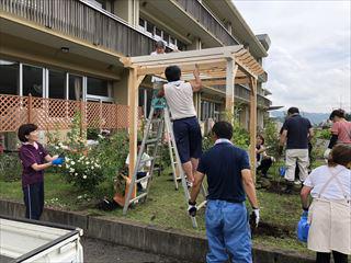 バラの管理育成作業が行われ、中学生及び地域の方々のボランティア29名でパーゴラづくりとバラの苗植えを行いました。