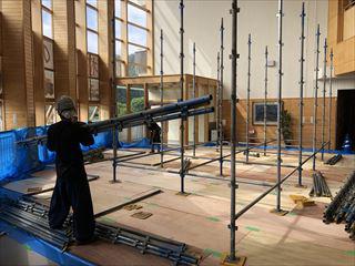学習センターの天井は雨漏りがひどく、天井や床にシミができていました。また、天井が剥離して落ちる危険も考えられました。そこで、天井を修繕工事することとなり、工事が始まりました。夏休みの期間に終了する予定です。