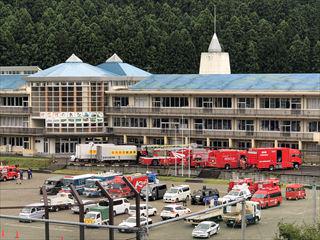 県総合防災訓練が粟野総合運動公園を会場に行われました。粟野中学校の校庭にも、たくさんの特殊車両が集まり、訓練の出番を待ちました。