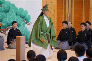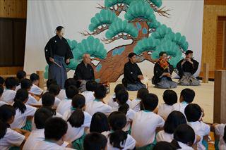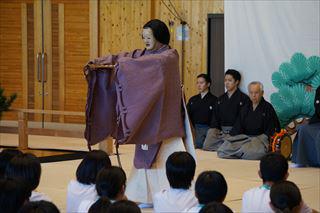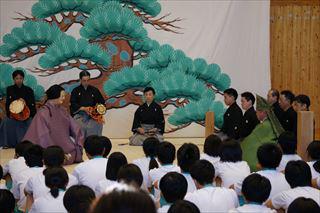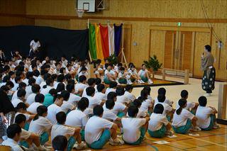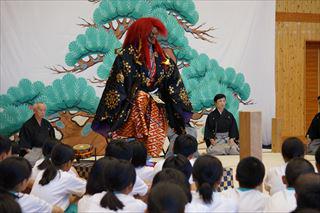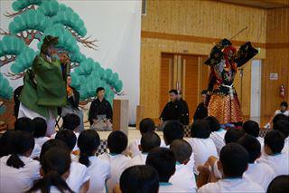 文化庁による「文化芸術による子供の育成事業」により、兵庫県の公演団体「瓦照苑」による能楽が粟野中学校で行われました。体育館に能舞台を設置し、能楽の説明、能面と囃子のお話、謡体験そして能『雷電』の鑑賞をしました。