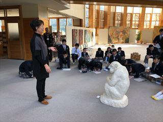 今日は埼玉在住の作家、髙橋千代子先生を講師に招いて、2年生を対象に芸術鑑賞教室を行いました。髙橋先生の作品は主に石膏彫刻で、人間に限らず生きとし生けるものに目を向けた作品づくりをしています。