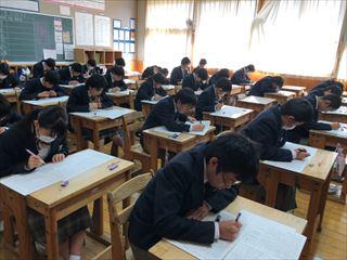 今日は2学期最後の定期テストが行われました。今日の日に向けて生徒たちは家庭学習を頑張ってきました。家庭学習の時間が増えた生徒が多いようです。また、3年生にとっては中学校最後の定期テストなので、一層力が入ります。
