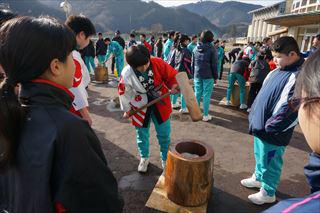 クラスごとに分かれて餅つきが始まりました。皆楽しそうです。
