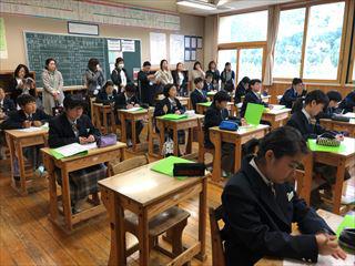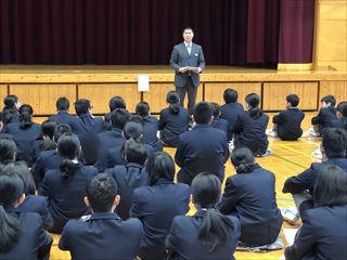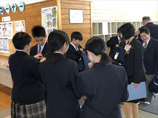 式後、対面式で、在校生からの「粟中エール」合唱で歓迎されました。