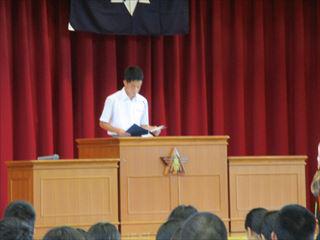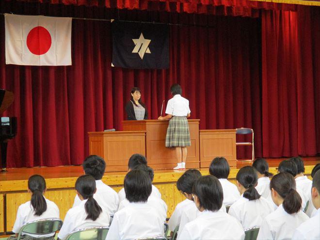 始業式が行われ、生徒の意見発表では、1年生からは「勉強を分かるまで頑張る」2年生からは「マイチャレンジを充実させたい」3年生からは「ボランティア活動で培った精神を学校や地域のために生かしたい」との発表がありました。