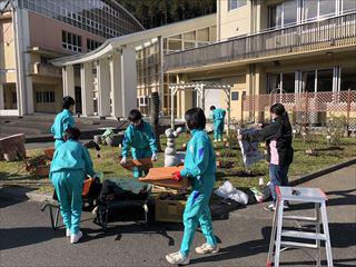 今年度、4回目のバラ管理作業が行われました。今回の主な作業は①つるバラの誘引作業と②バラの追肥作業(寒肥)の2つです。地域ボランティアの方々にはつるバラの誘引作業を、中学生ボランティアは追肥作業を行いました。来年の開花に向けて準備が始まりました。