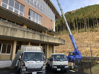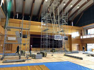 体育館のバスケットゴールの改修工事が始まりました。今日は工事のための足場が運ばれ、体育館に足場が組まれました。天井まで届く足場は迫力があります。工期は1月15日までの予定です。