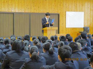 式は学校長の話、生徒代表2学期の反省、そして大きな声で校歌を斉唱しました。