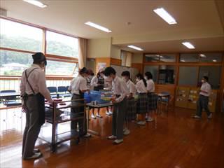 当番が1人1人に配る形を変更し、各自が順番に自分の分を受け取りに来ることで、できるだけ他者との接触を避ける形で配膳を行っています。給食当番は、給食の白衣の共用は避け、個人でエプロンを用意して配膳します。