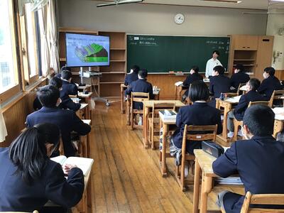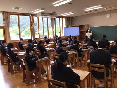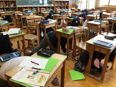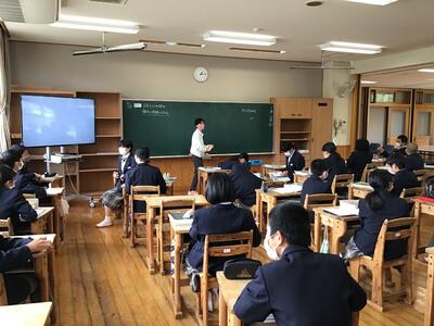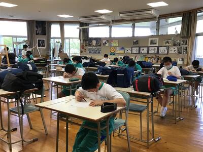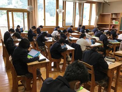 時間の最後に地震を想定した避難訓練になりました。災害は予測不能です。粟野中学校では予告なしの避難訓練を行います。いざというときに、自分の身を守れるように、冷静な判断をして、行動できるスキルを身につけるために行いました。