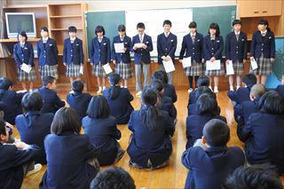 昨日の5時間目終了後、今学期最後の学年集会がありました。各学級の代表から、今年度印象に残ったことの発表がありました。初めての定期テスト、部活動などそれぞれが大いに活躍した1年間でした。その後、冬休みの過ごし方について話があり、生徒たちは年末年始に向けて期待を膨らませていました。