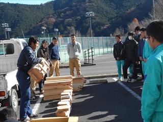 県の林業振興政策で林業と建築資材としての木材のお話と木材を使ったプランター作りを行いました。
