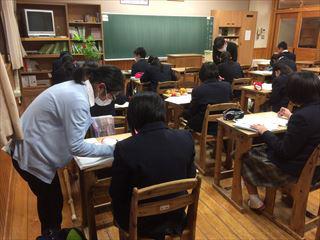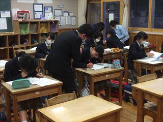 先週から3年生対象に、年明け早々に行われる私立高校入試に向けての学習相談が始まりました。基本的に自習形式で行われますが、分からないところは教師に質問することで解決していきます。外が暗くなるまで、24名の生徒が希望し学習を頑張っています。