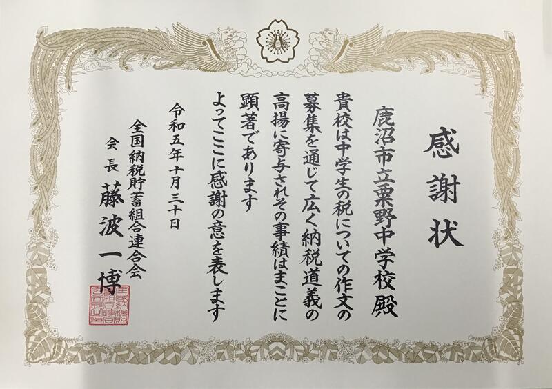 11月16日(木)全国納税貯畜組合連合会様より、本校が中学生の税についての作文募集を通して、納税についての知識を深めていることについて、表彰を受けました。