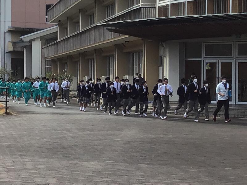 午前中に小雨が降っていたため、急遽、避難場所を変更して行いましたが、生徒の皆さんは、慌てず喋らずに避難できました。