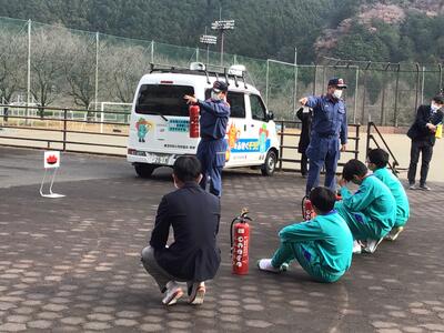【生徒の感想】実際に消化器を使って消化活動の体験をしました。経験を生かして火災現場に遭遇したら、素早い判断を心がけたいと思いました。