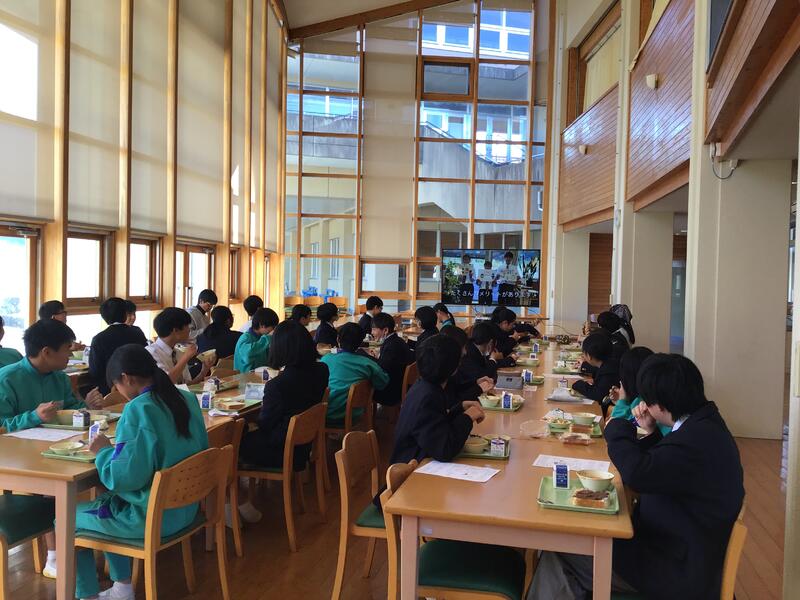 保健委員委員の生徒が中心となり、「朝ごはんを食べること」の大切さを伝えるために、保健委員会で作成したVTRを、給食を食べながら視聴しました。