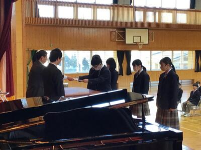 12月25日、表彰式、終業式が粟野中学校体育館で行われました。