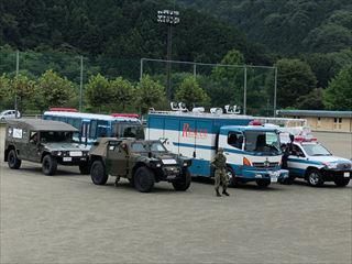 粟野中学校は特殊車両の駐車場となり、訓練に合わせて運動公園に移動します。今日はそのリハーサルが行われました。宇都宮市、鹿沼市、日光市などのたくさんの特殊車両が集まりました。
