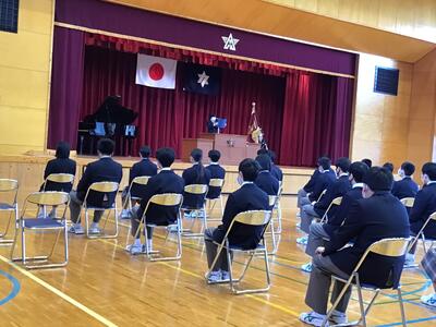 令和4年度1学期始業式が行われました。校長からの式辞、代表生徒2名が新年度の決意を発表しました。