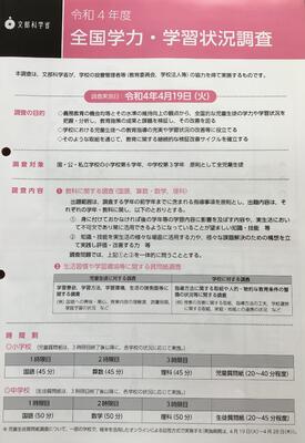 全国学力・学習状況調査を4月19日に国語、数学、理科の3教科を行いました。