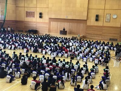 新生徒会長からは、「今年度も校則の見直しを行います。見直しを図る中で、東中一人一人が校則の内容や必要性を考える機会にしてほしいと思います。よりよい東中にするために皆さんの協力が必要です。よろしくお願いします。」との話が全生徒に向けてありました。