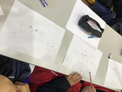 後半の実技実演では、二つの丸を描き、その中に「へのへのもへじ」を描くというユニークな方法を教えていただきました。描く位置やバランスを少し変えるだけで、大人の顔にも子どもの顔にも見えることを実演してくださり、生徒たちは感嘆の声を上げながら、興味深そうに取り組んでいました。