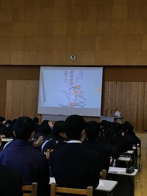 前半の講話では、先生の生い立ちから幼少期のお話、マンガを描くきっかけとなった出来事、戦中後の中国での暮らしなど、先生自身の様々なお話を伺えました。さらに、講話中イラストも交えながら、鳥獣戯画をベースにマンガの成り立ちや日本のマンガ文化についてもご教授いただきました。