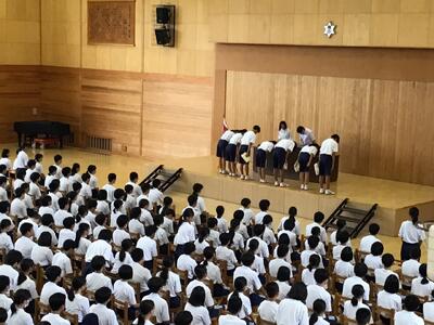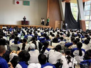 受賞伝達式後、校長からは、「努力の成果が報われた活躍した人おめでとうございます。色々な場に見学に行きましたが、見学した際、団体競技では、チームで声をかけ1つの目標に向かう姿、個人競技では自分の力を最大限に発揮できるよう考えて競技していた姿が見られ素晴らしかったです。」