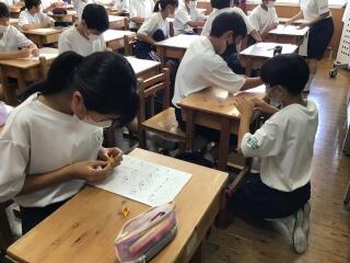 各学級に配付された折り紙を使い、一人一人が平和への願いを込めて、折り紙の裏面にメッセージを書き込み、丁寧に鶴の作成を行いました。1年生は初めてのため、3年生の各学級から2~3名の鶴マスターが1年生の教室に行き、丁寧に教えながら鶴の作成をサポートしました。