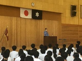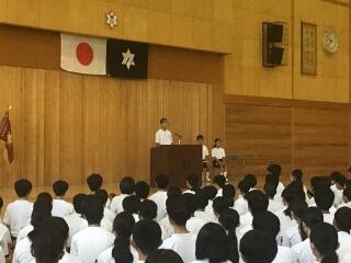 学校長からは、①2学期は新組織や新チームが組まれることから、1学期の良い実践をもとに2学期も頑張ってほしいということ、②あいさつの実践を続けていってほしいこと、③卒業式に向けて、送られる側も送る側も胸を張って迎えられるように、日々の振り返りをしっかりと行って生活してほしいこと、の3つの話が生徒に送られました。