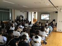 今回は、パワーポイントでスライドを用いて話をしました。生徒たちは、これからの夏休みに向けて、真剣に話を聞いていました。