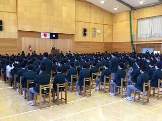 学校長からは、①2学期の振り返りをしっかりと行ってほしいこと、②次の目標を立てて努力してほしいこと、③休み中も規則正しい生活を心掛けてほしいこと、の3点の話が生徒に送られました。
