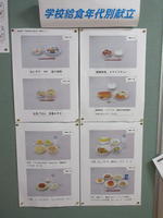 保健室前には、学校給食週間にあわせた掲示もあります。給食の始まりや献立の変化を紹介しています