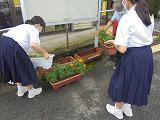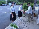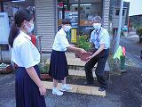 愛校の日に花を移植したプランターを郵便局とコミュニティーセンターに置かせていただきました。下校時間を利用して、代表生徒が伺い、お渡しました。