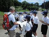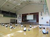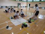 体育館を使って互いのスペースを取りながら、午前中は、ガイダンスと野外での実地体験、給食をはさみ、午後も体育館でグループごとに防災マップづくりを行いました。