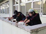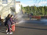 避難終了後には、校庭から食堂前に異動しました。そこで、生徒による消火器(中身は水です)の使い方を消防署の方に教えていただき、その後、実際に消火器を使いました。