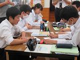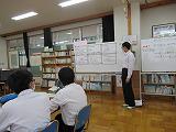 市教育委員会の指導主事に訪問を依頼して、研究授業を行いました。3年生の理科の授業を図書室で実施しました。エネルギーの分野の内容の授業を行いました。生徒一人人が自分の考えを資料に基づきまとめ、その後、グループでの提案を行いました。