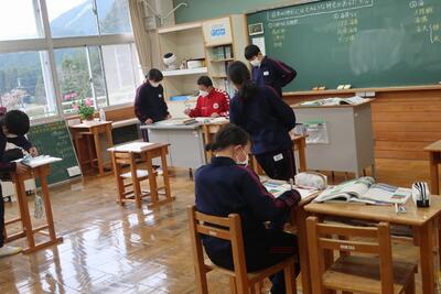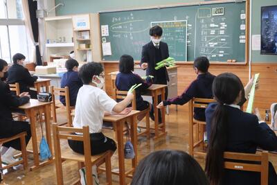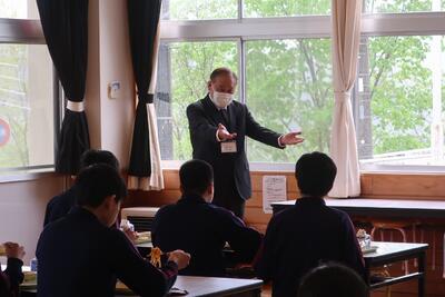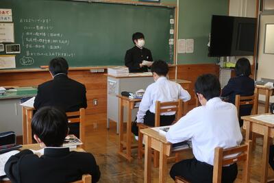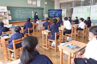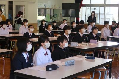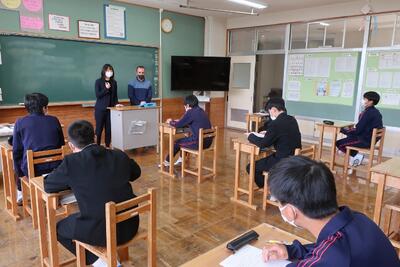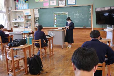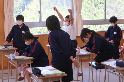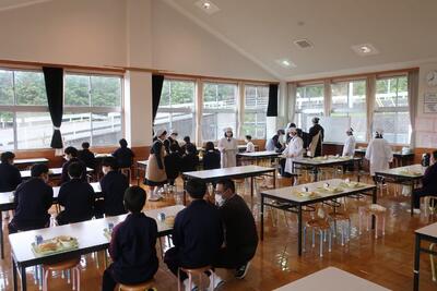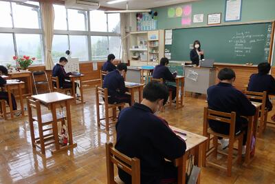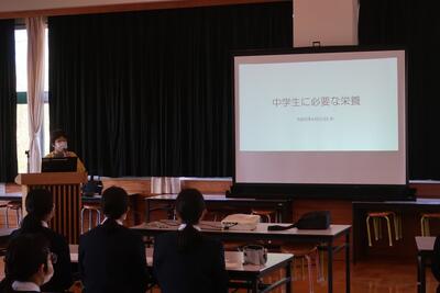 今日は、朝の活動で板荷小学校から栄養教諭の先生をお招きして、「中学生に必要な栄養」という内容で食育講話をしていただきました。予定していた8:00前に集合して、予定より少し早くスタートすることができました。すばらしいですね。