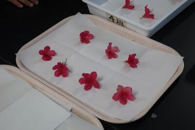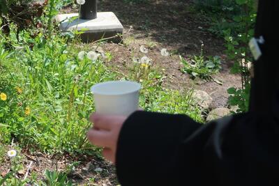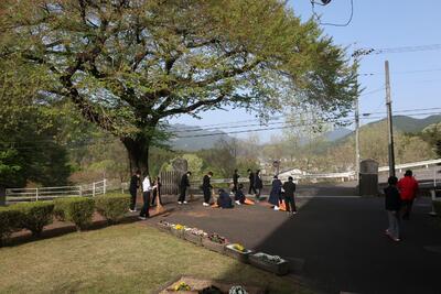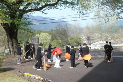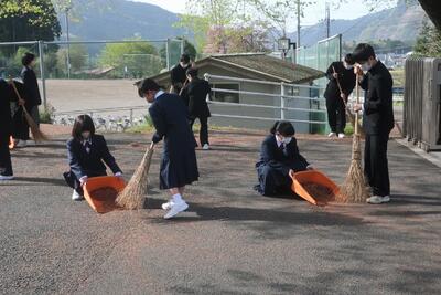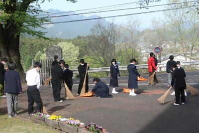 登校した生徒たちが、エドヒガン桜が散らした花軸を掃いてくれていました。