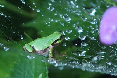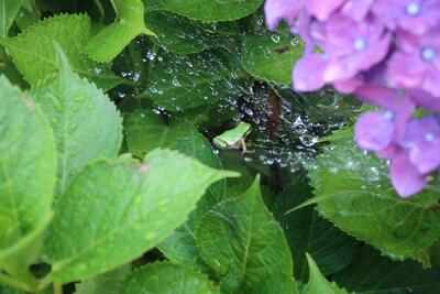 クモの巣の上に、アマガエルがちょこんと乗っていました。