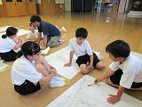 交流センターに到着後、入所式、ネイチャーゲーム、災害マップづくりを行いました。マップづくりでは、災害が発生した場合に、安全に自宅までに戻るルートなどの確認をしました。